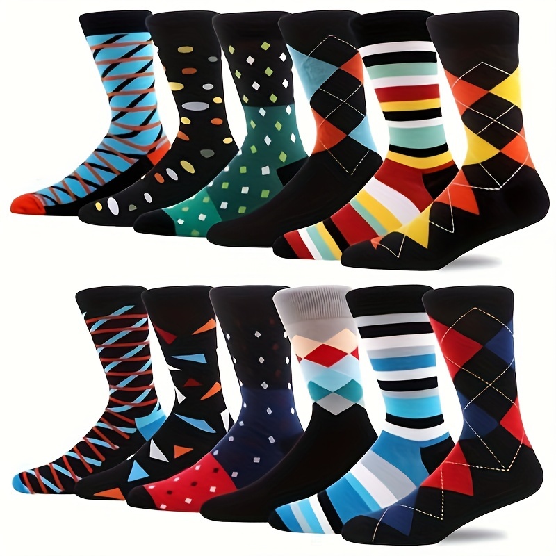 12 Pairs Of Men’s Socks Geometrically Patterned Full-size Crew Socks (US 7-12)