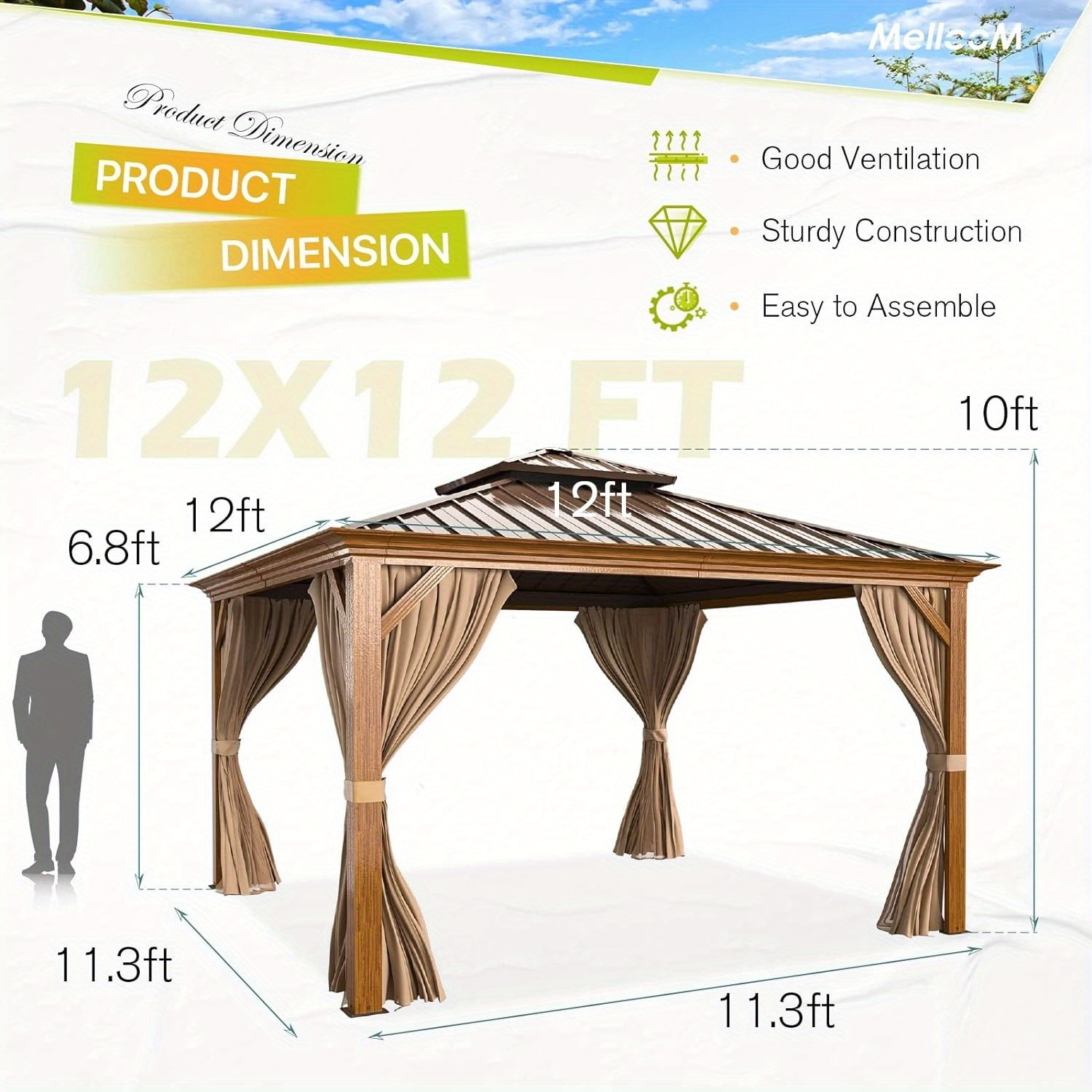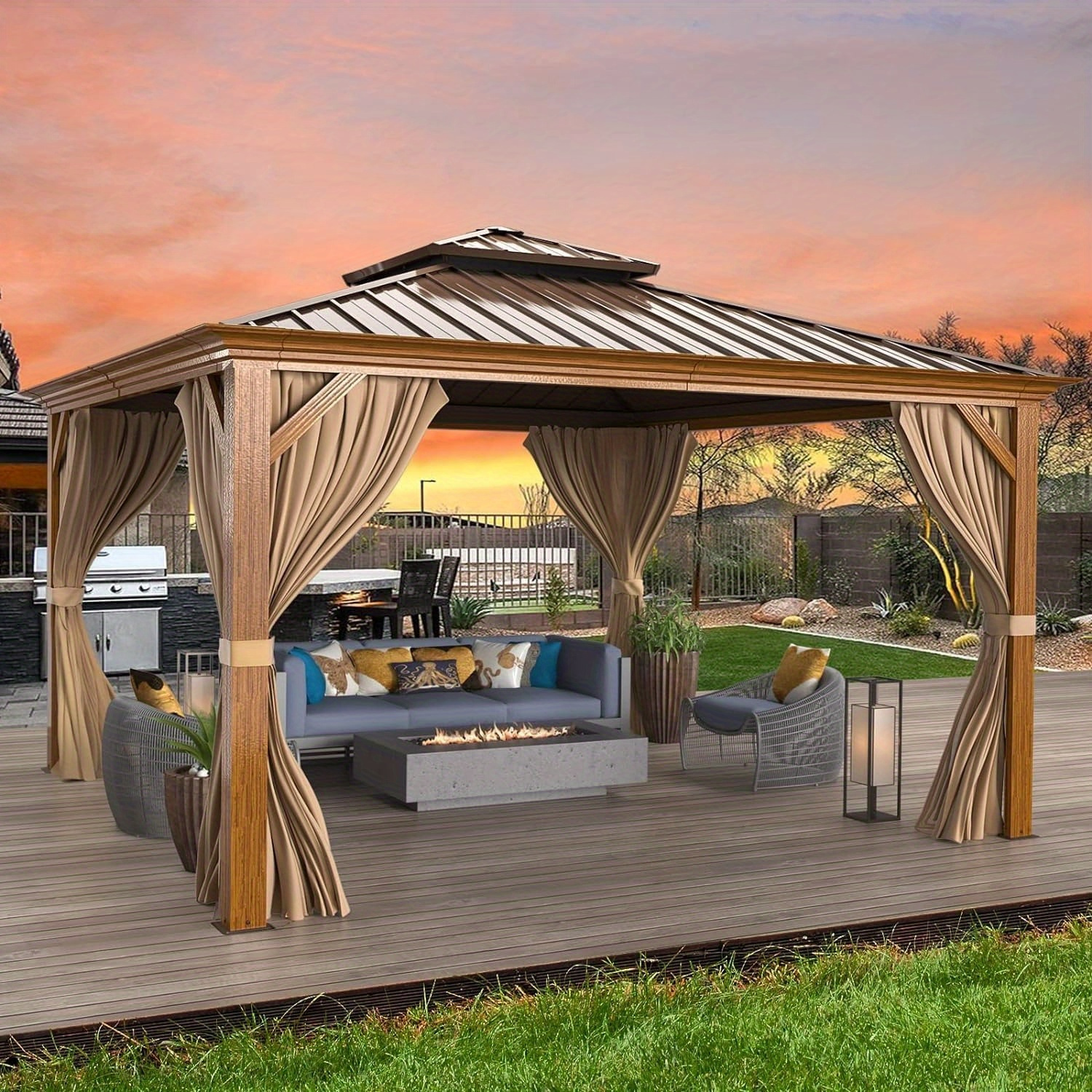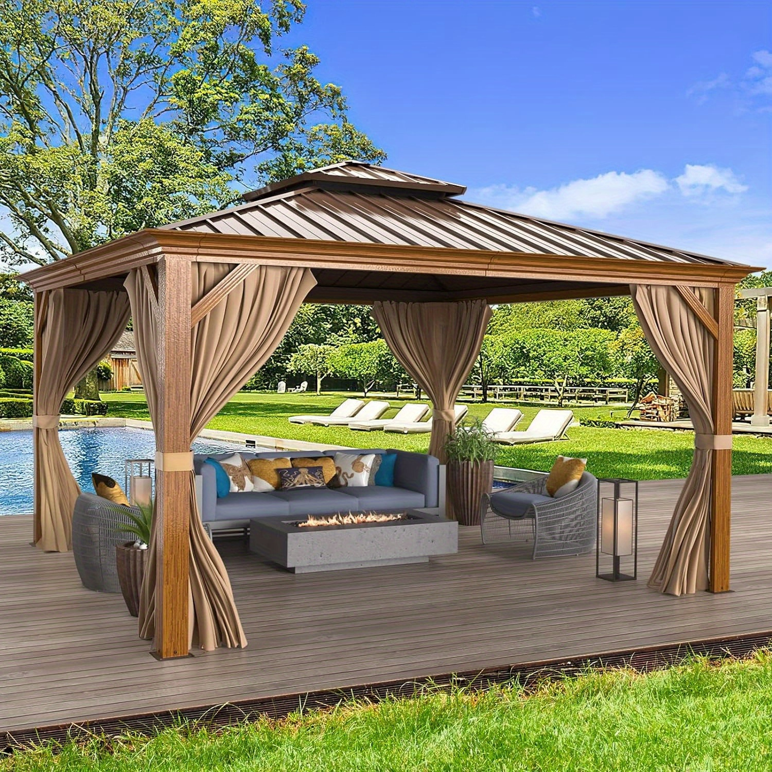 12′ x 12′ Hardtop Gazebo, Wooden Finish Coated Aluminum Frame Gazebo with Galvanized Steel Double Roof, Brown Metal Gazebo with Curtains and Nettings for Patio, Lawn & Garden