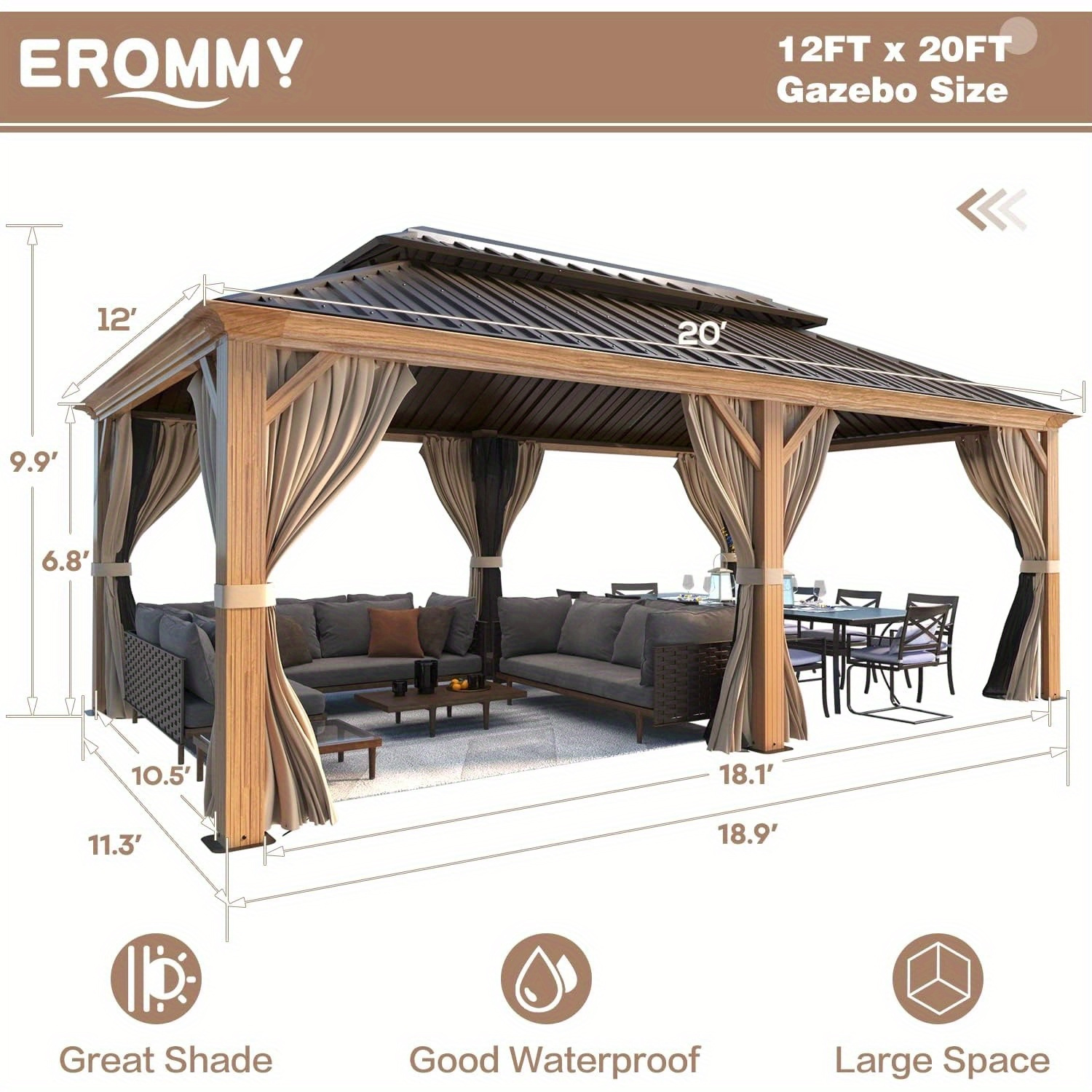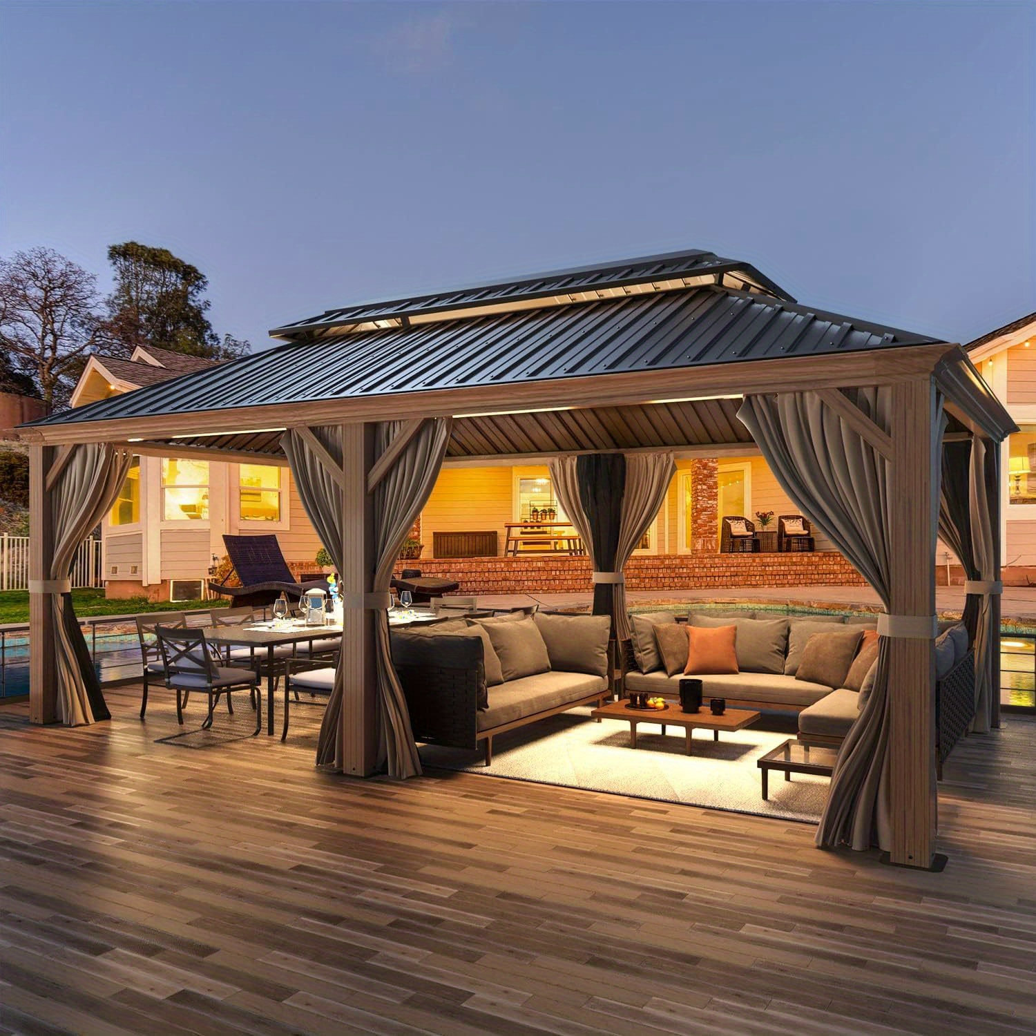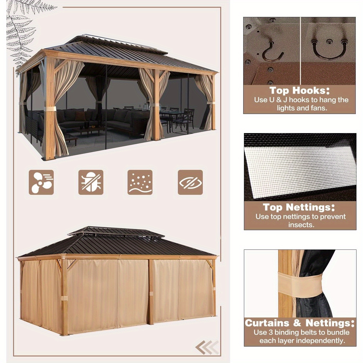 12’x20′ Hardtop Gazebo, Wooden Finish Coated Aluminum Frame Gazebo with Galvanized Steel Roof, Outdoor Metal Gazebos with Curtains and Nettings for Patio, Backyard, Deck and Lawns
