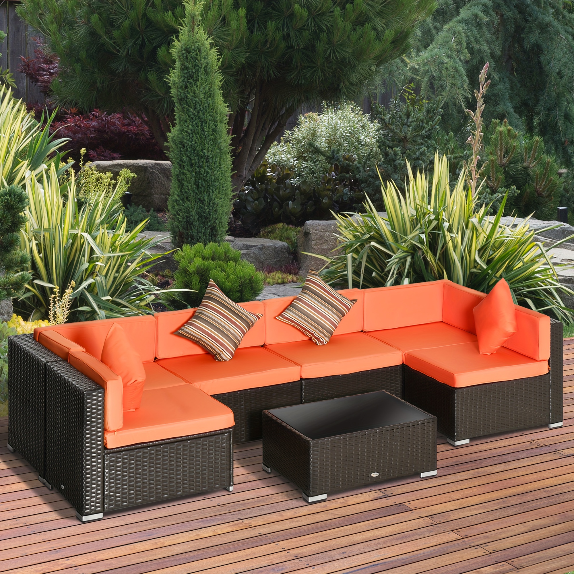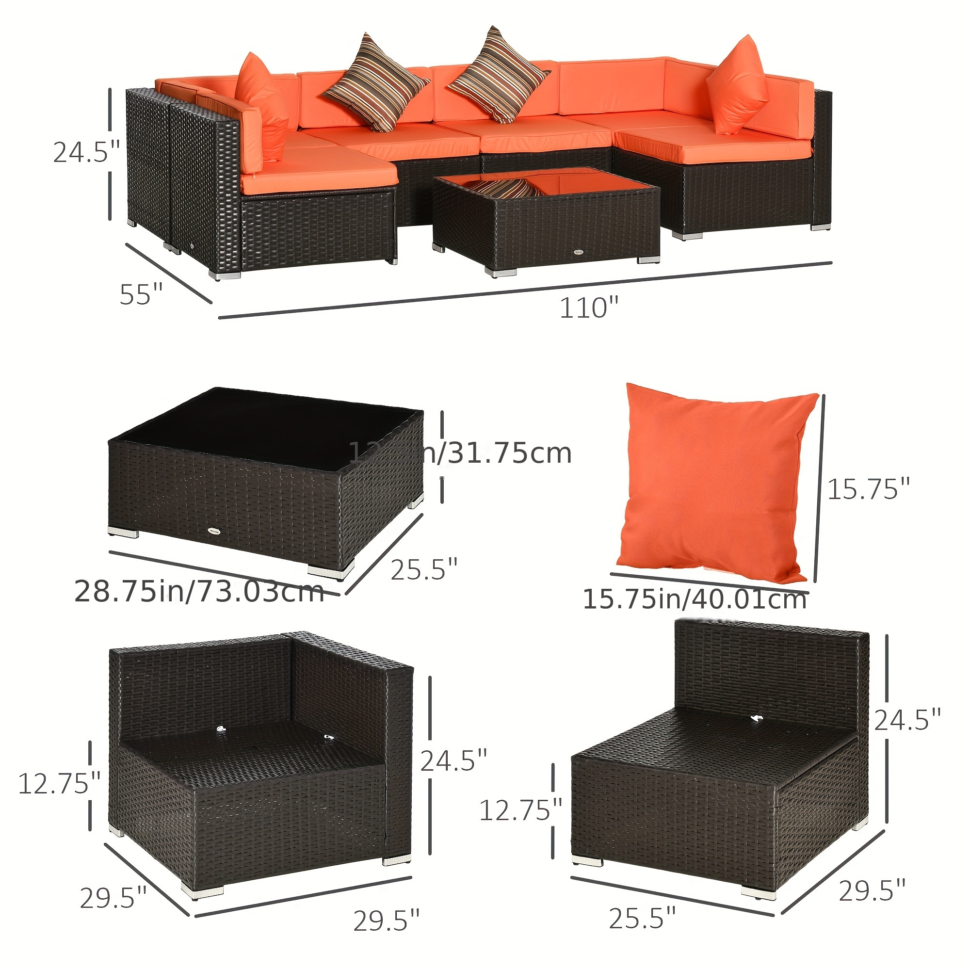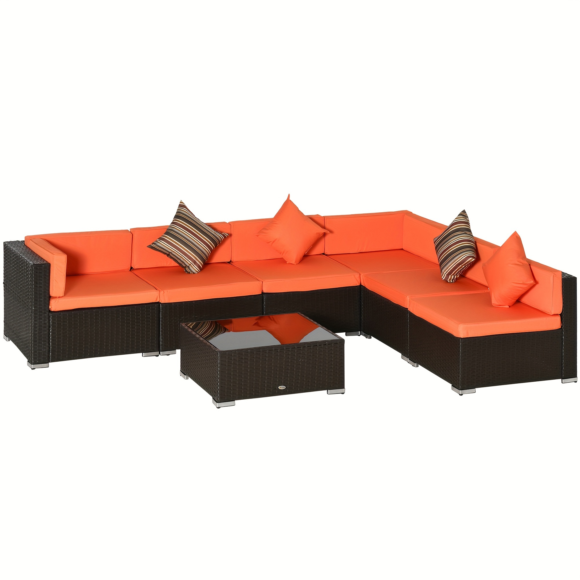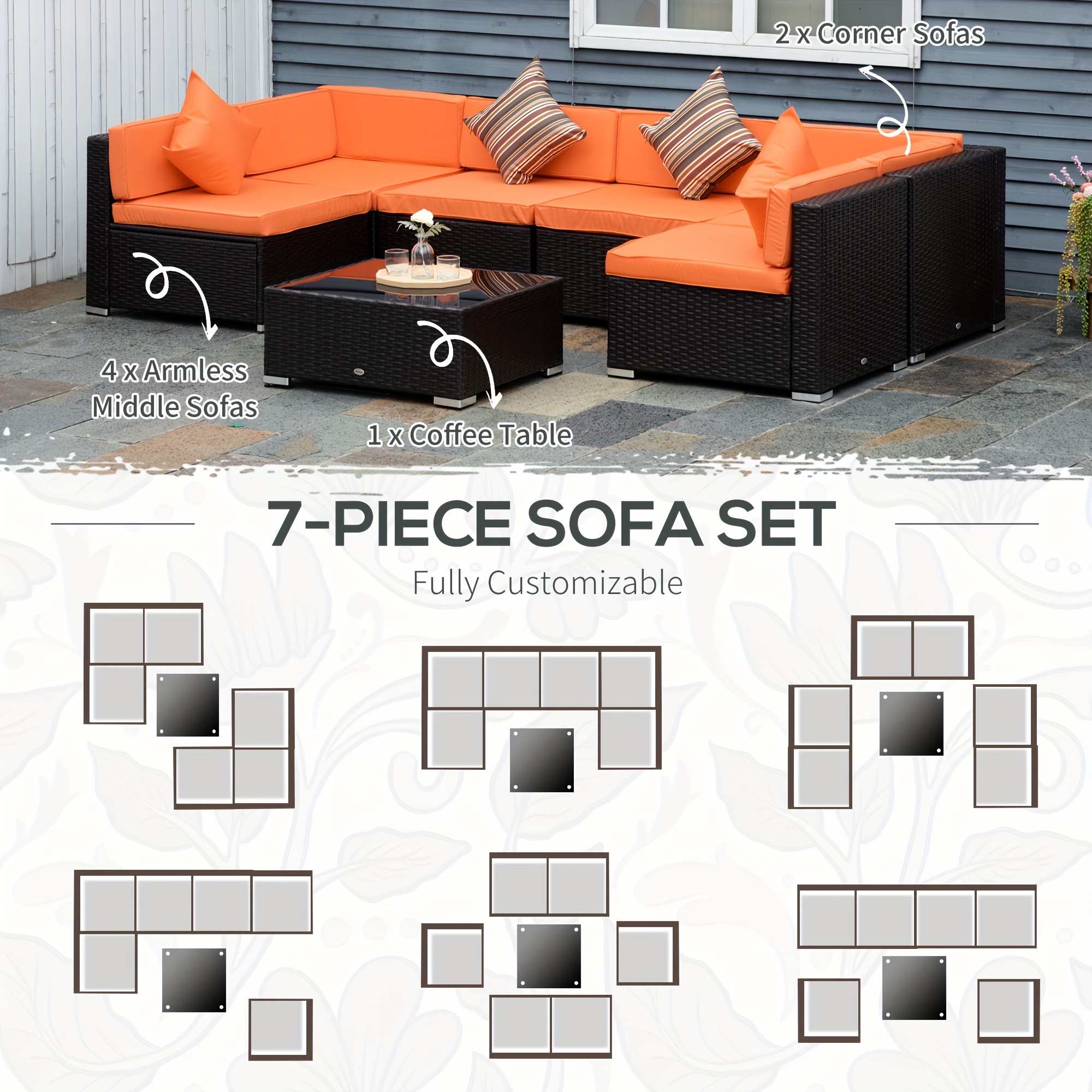 7 Piece Patio Furniture Set, PE Rattan Outdoor Conversation Set with Sectional Sofa, Glass Tabletop, Cushions and Pillows for Garden, Lawn, Deck, Coffee and Orange