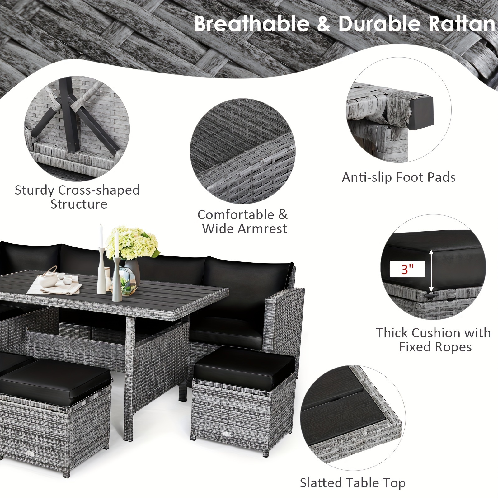 7pcs Patio Rattan Dining Set Sectional Sofa Couch Ottoman Garden Sofa Set